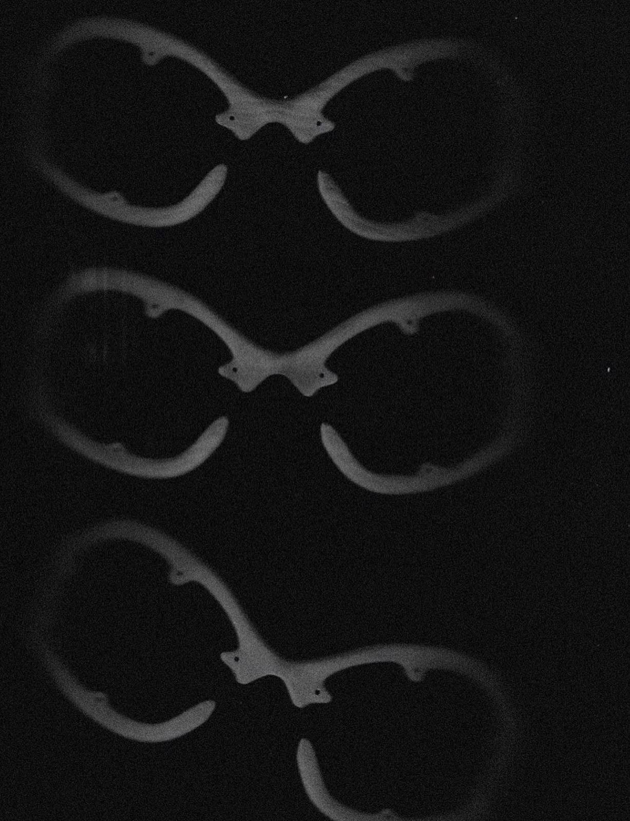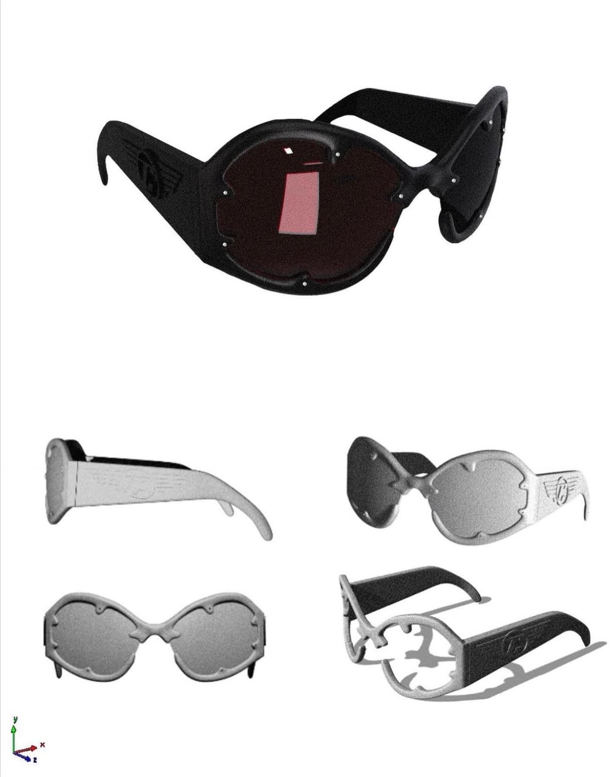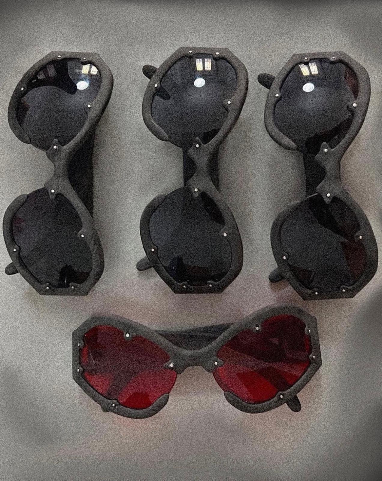 Las gafas se fabricaron mediante impresión 3D en Nylon PA12, un material ligero, resistente y adecuado para detalles precisos. Tras la impresión, cada unidad se lijó, ensambló y ajustó manualmente, combinando tecnología avanzada con un acabado artesanal. Las lentes —en versiones oscuras o rojas— aportan contraste y refuerzan la estética de objeto experimental.